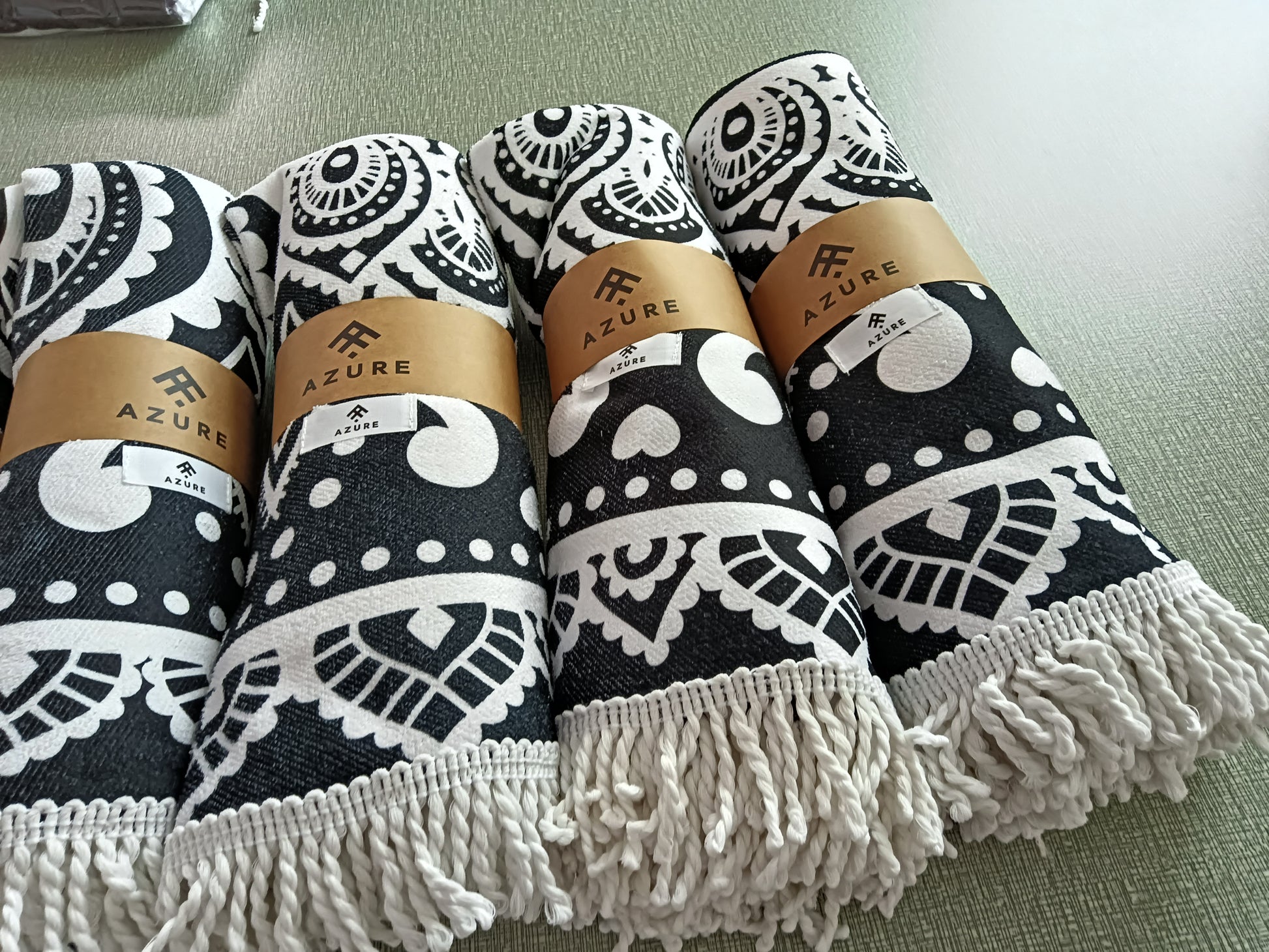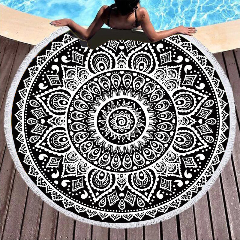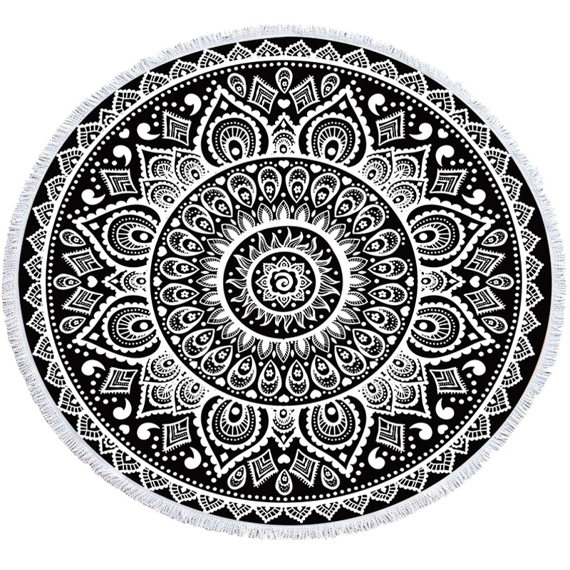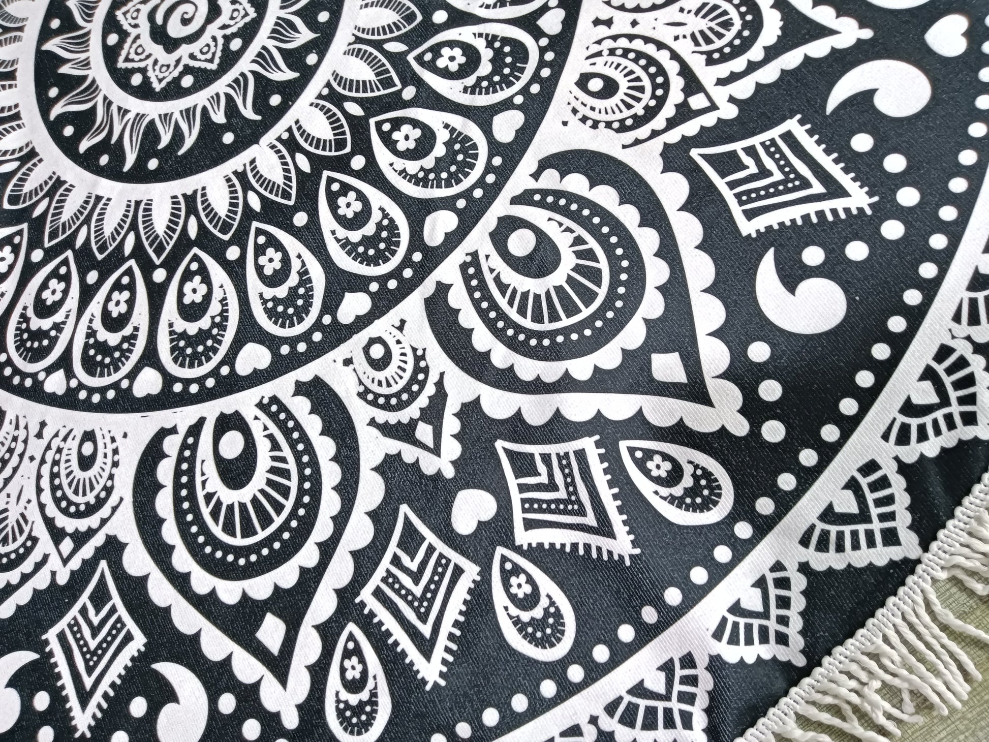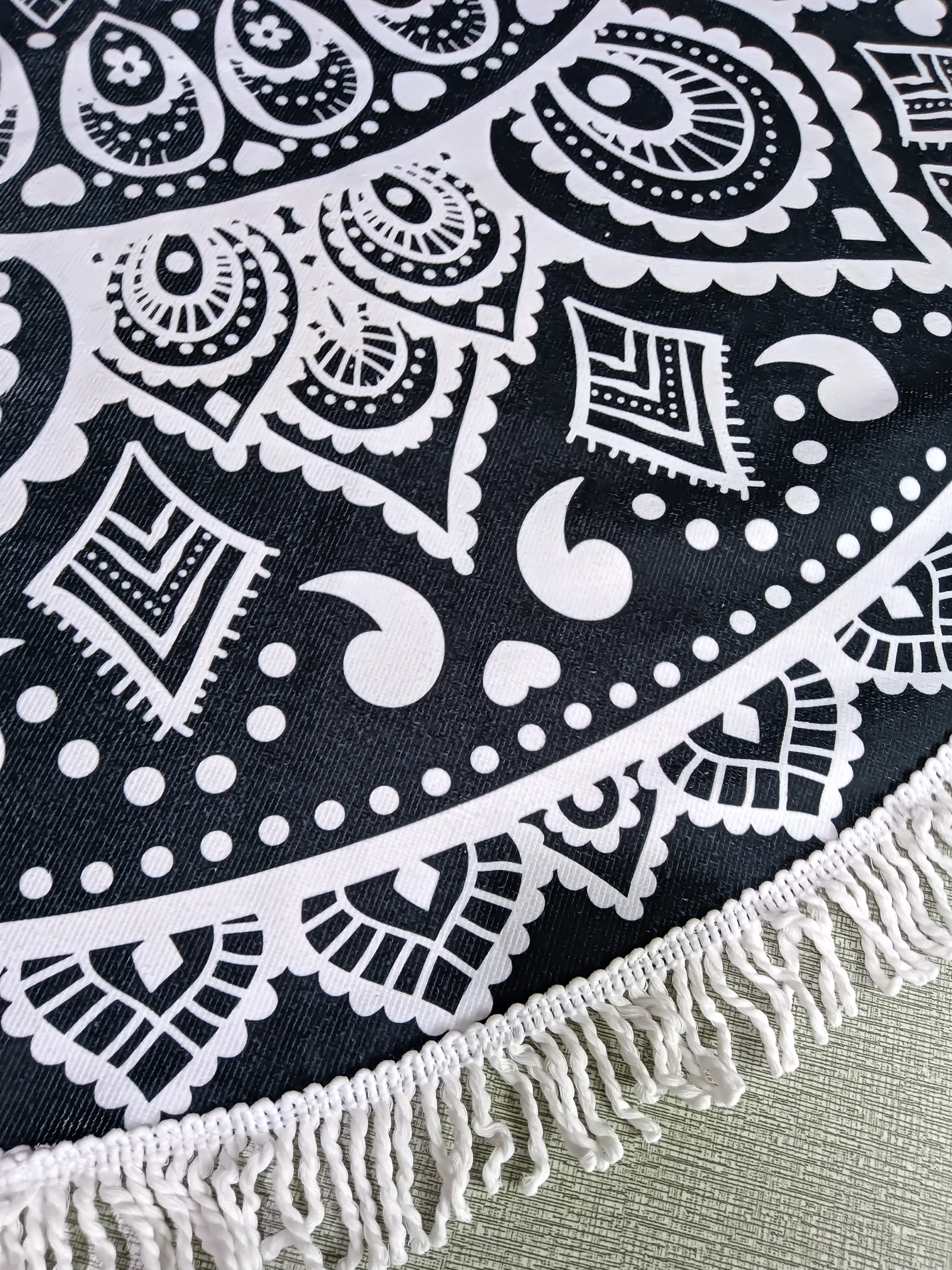 Bring style and comfort to your beach days with the Sylphine circular beach towel. Featuring a striking black-and-white bohemian mandala pattern, this towel is designed to stand out while offering versatility. Made from 100% microfiber polyester, it’s soft, lightweight, and highly absorbent—perfect for lounging poolside, drying off after a swim, or using as a picnic or yoga mat.